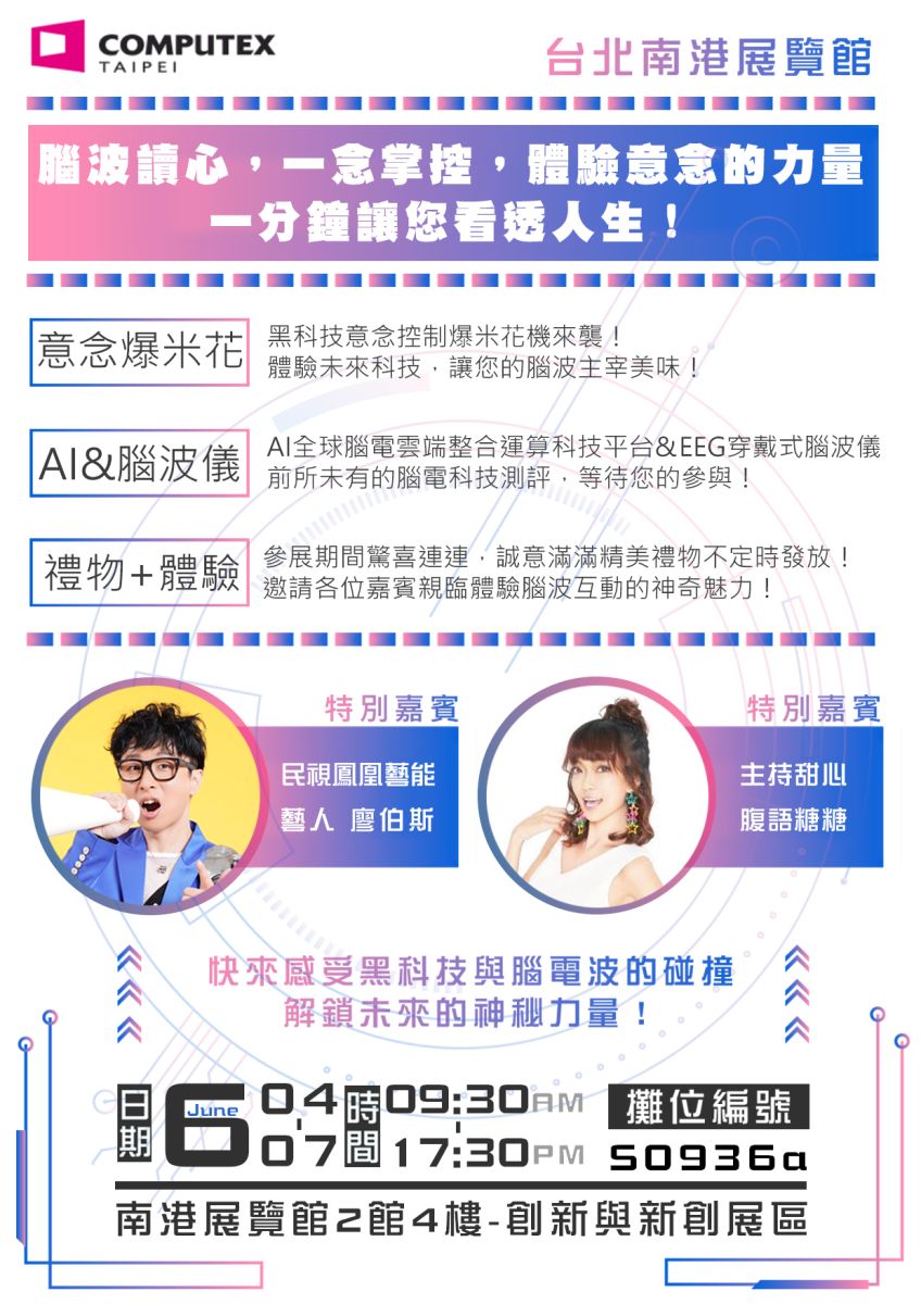 展覽期間,您將有機會與知名甜美主持人 糖糖 近距離互動,親身體驗黑科技腦電波的神奇力量,並有機會獲得精美小禮物!